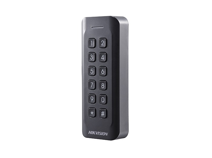 Card reader Hikvision, DS-K1802EK; Reads EM card, with keypad; Card Reading Frequency: 125KHz; Processor: 32-bit; Reading Range: ≤50mm (≤ 1.97"); Supports Wiegand(W27/W35) protocol, Dust-proof, IP 65.