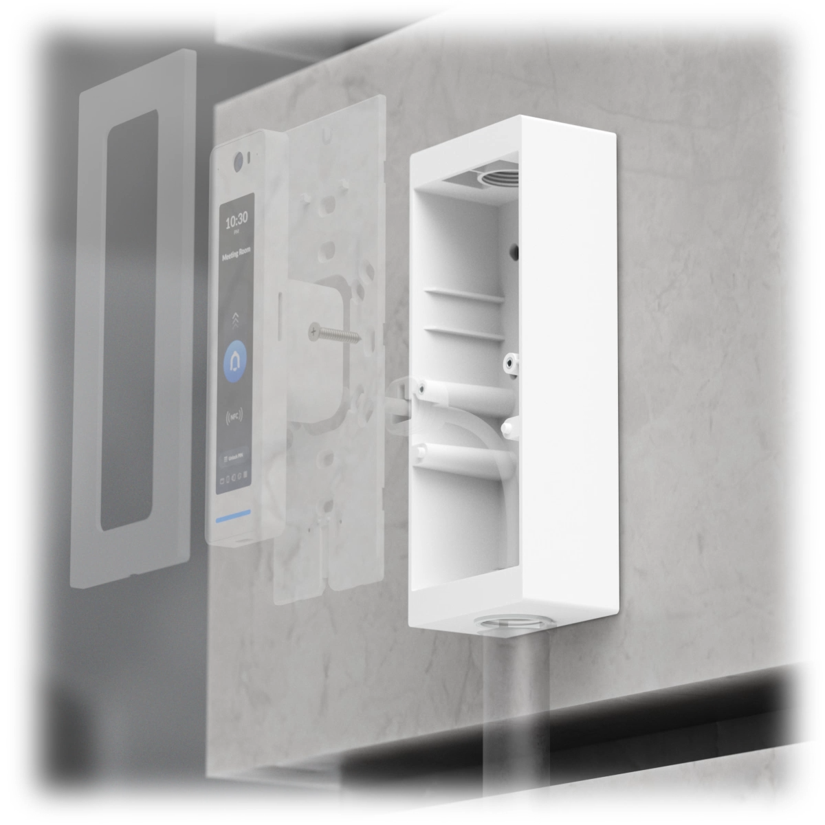 Junction box for UniFi Professional Acce β Junction box for UniFi Professional Access Readers and Doorbells that supports flat surface mounting and attachment to 3/4" conduit.