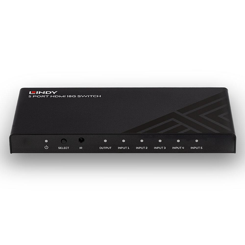 Lindy 5 Port HDMI 18G Switch Technical details Specifications AV Interface: HDMI Interface Standard: HDMI 2.0 Supports Bandwidth: 18Gbps Maximum Resolution: 3840x2160@60Hz 4:4:4 8bit HDCP Support: HDCP 2.2 Supported Audio: Audio Pass-through Separate β Lindy 5 Port HDMI 18G Switch Technical details Specifications AV Interface: HDMI Interface Standard: HDMI 2.0 Supports Bandwidth: 18Gbps Maximum Resolution: 3840x2160@60Hz 4:4:4 8bit HDCP Support: HDCP 2.2 Supported Audio: Audio Pass-through Separate Audio Ports: - IR Support: 38kHz CEC Support: Yes Serial Interface: - Special Features: HDR10 & Dolby Vision Support