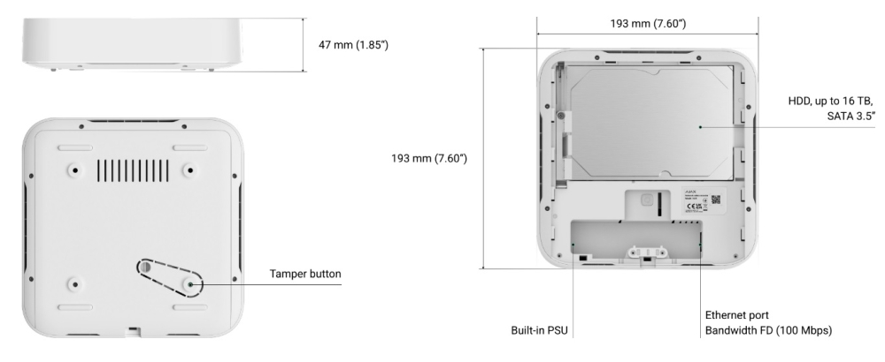 NVR CU 16 CANALE, ALB, 9-16 VDC β NVR Ajax cu 16 canale, culoare alba, integrare camere third-party cu sistemul Ajax, 4K rezolutie max. inregistrare (25/30 fps), H.265/H.264, banda max. 100 Mbps, conectivitate SATA, marime 3.5", capacitate 16 TB / HDD, IP20, dimensiuni 193 x 193 x 47 mm, greutate 583g, alimentare 9 - 16 VDC, consum max. 24 W, compatibilitate cu toate centralele HUB Ajax