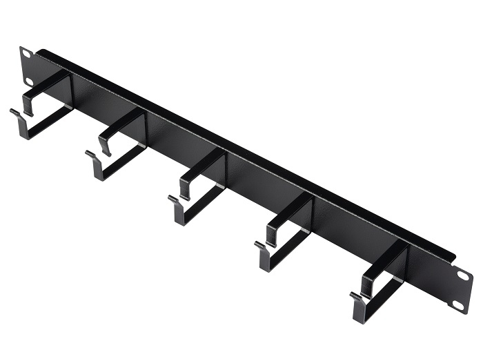 ORGANIZATOR CABLURI 19", 1U, 5 INELE, NEGRU — Organizator de cabluri cu 5 inele, 19", 1U, culoare neagra, latime neta 485 mm, inaltime 45 mm, adancime neta 82 mm, masa neta 0.29 kg, temperatura 5°C ~ 40°C