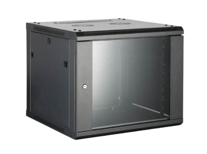 RACK 19", 9U, 600*450*500 MM, DE PERETE β Rack 19 inch, 9U, montare pe perete, capacitate incarcare statica 40kg, dimensiuni 600 * 450 * 500 mm, greutate neta 18.7 kg, material SPCC, usa in partea din fata - 4 mm sticla, 1 mm SPCC, deschidere usa in procent de 78%