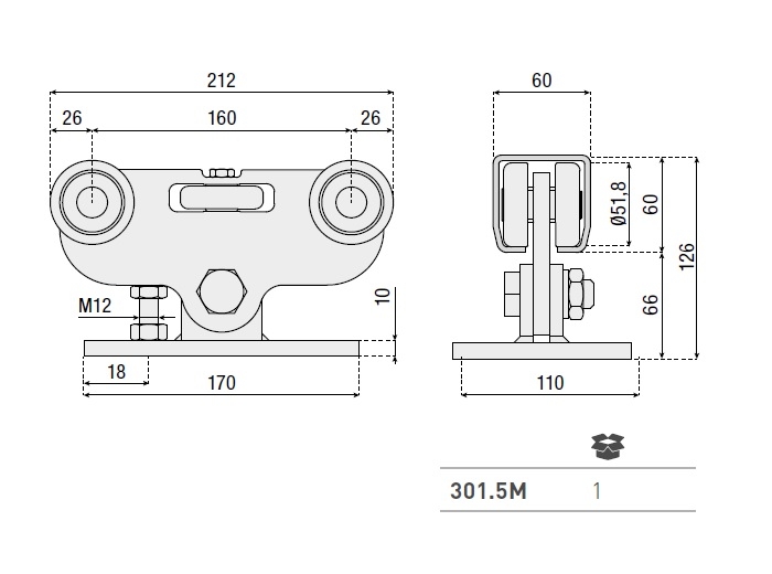 SUPORT M PENTRU ROTI DIN SERIA M β Suport cu 5 roti pentru seria M