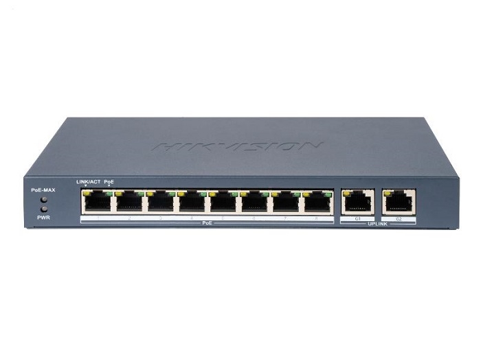 Switch PoE Hikvision DS-3E0310P-E/M(B): 8 × 10/100 Mbps PoE port, and 2 × Gigabit RJ45 port, PoE standard: IEEE 802.3af;IEEE 802.3at, 8 porturi PoE maxim 30W, buget PoE 80W, tensiune alimentare: 54VDC, 1.2A, dimensiuni: 217.60 mm × 27.60 mm × 108.50 mm,