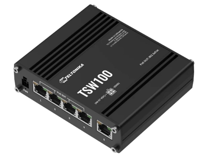 TSW100 - SWITCH POE+ CU 5 PORTURI GBE β Switch unmanaged cu 5 porturi ETH 10/100/1000 Mbps (dintre care 4 PoE, max. 30W / port PoE), standarde seria IEEE 802.3 (802.3i, 802.3u, 802.3ab, 802.3x, 802.3az), 1 indicator LED pentru alimentare, 10 indicatoare LED pentru status ETH, tensiune alimentare 7-57 VDC, tensiune intrare PoE-out 44-57 VDC, carcasa din aluminiu, IP30, montare - sina DIN, pe perete/suprafata plata (toate neceista kit aditional)