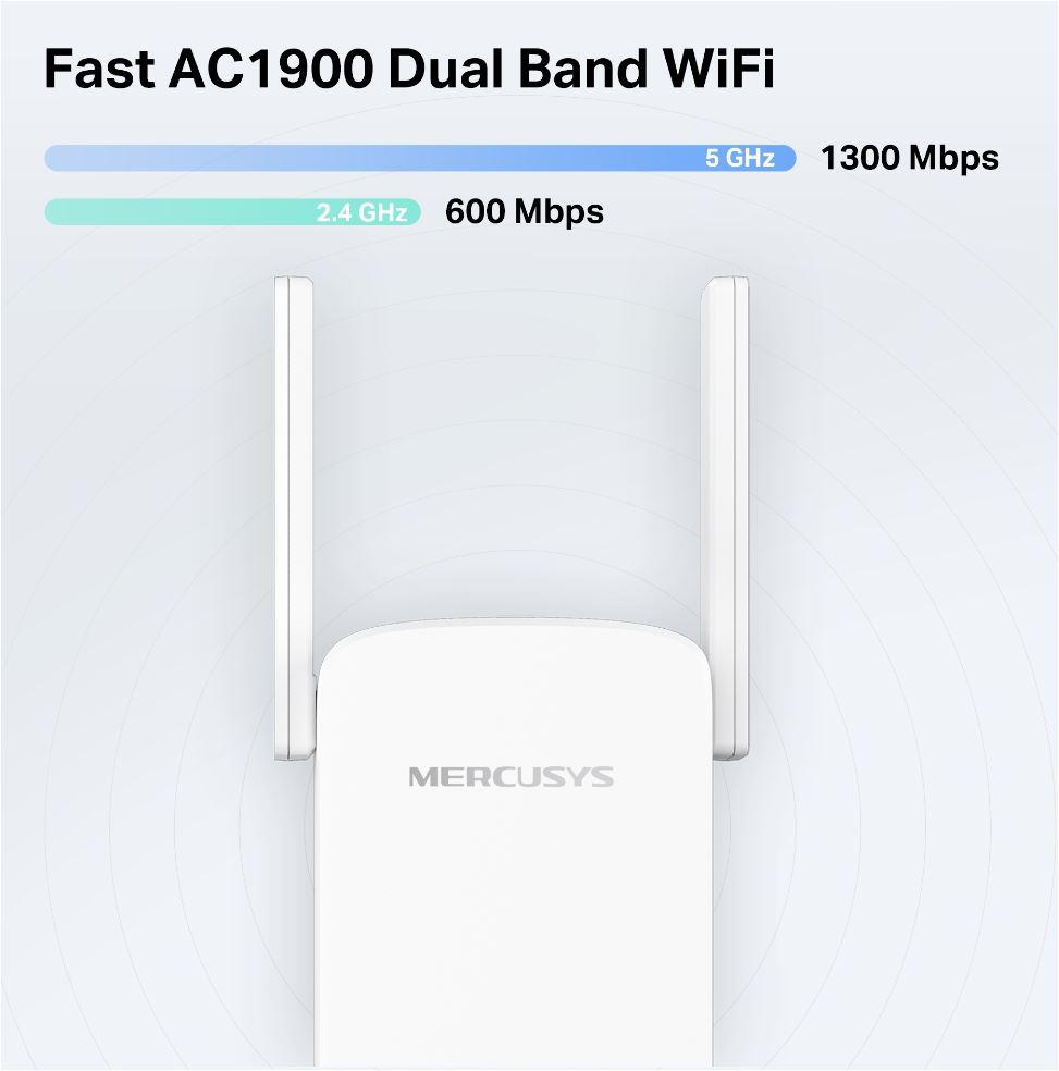 Wi-Fi Range Extender Mercusys AC1900 ME50G; Dual-Band, Standarde Wireless: IEEE 802.11a/n/ac 5 GHz, IEEE 802.11b/g/n 2.4 GHz, Viteza wireless: 600 Mbps at 2.4GHz, 1300 Mbps at 5GHz, Interfata: 1 x Gigabit Ethernet Port, 4 x Andene externe, Consum: 12W, Dimensiuni: 84.7×76.3× 112 mm. — Wi-Fi Range Extender Mercusys AC1900 ME50G; Dual-Band