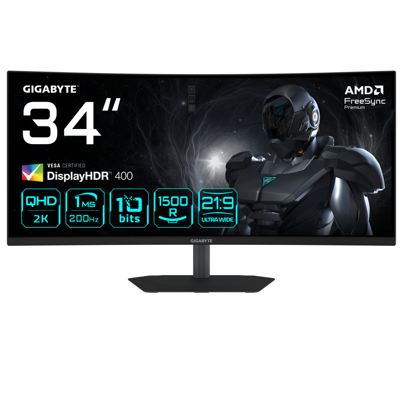 GIGABYTE G34WQC2 34” WQHD Curved Gaming Monitor - 3440 x 1440, 1500R, 200Hz, 1ms, 450 cd/m2, AMD FreeSync Premium, DisplayHDR 400, HDMI 2.0, Displayport 1.4. Display diagonal: 86.4 cm (34"), Display resolution: 3440 x 1440 pixels, HD type: UltraWide Quad HD, Display technology: LED, Display surface